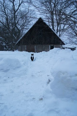 Stara chata z bali, dookoła las, koty, cisza, widok na zamarznięte jezioro i rzekę a wszystko to utopione w dziewiczym śniegu po pas...